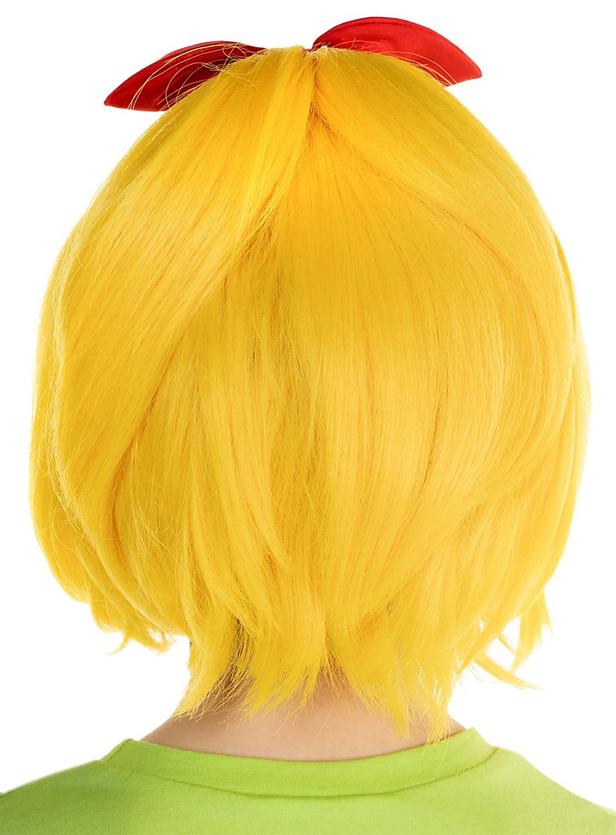 Peluca súper mágica de Bibi Blocksberg con pelo amarillo brillante peinado en coleta y lazo rojo.