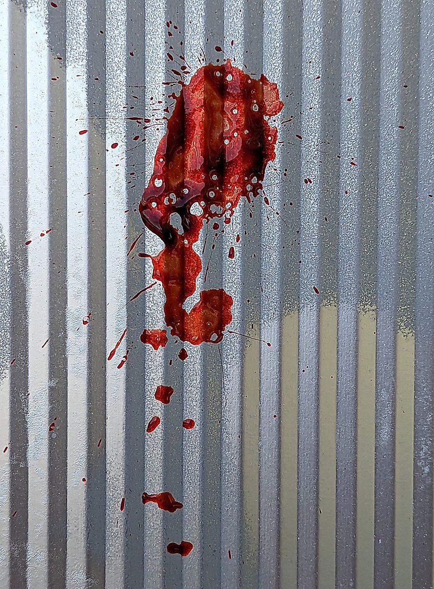 • dos efectos diferentes: salpicaduras gruesas de sangre artificial como con una pistola de agua y salpicaduras más amplias de sangre cinematográfica