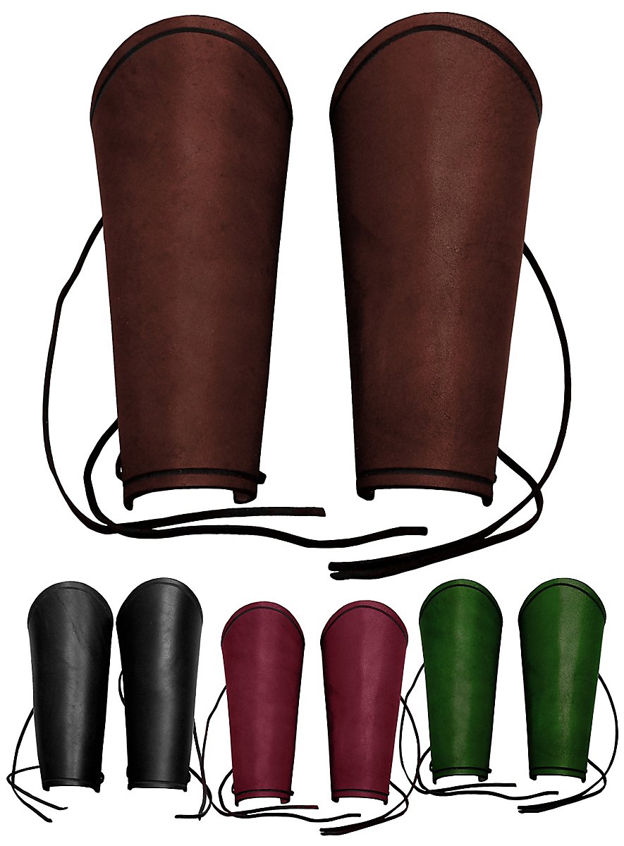 Sie sind aus pflanzlich gegerbtem, gut 3 - 4 mm starkem Rüstleder gefertigt und mit einer Rillenverzierung versehen. Sie werden mithilfe der beiden mitgelieferten, jeweils ca. 1,5 m langen Lederbänder geschnürt und lassen sich dadurch für besten Tragekomfort problemlos anpassen. So seid Ihr für die nächste LARP-Schlacht bestens gerüstet.