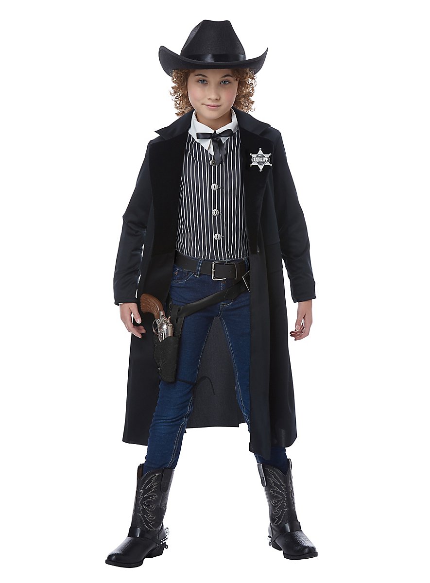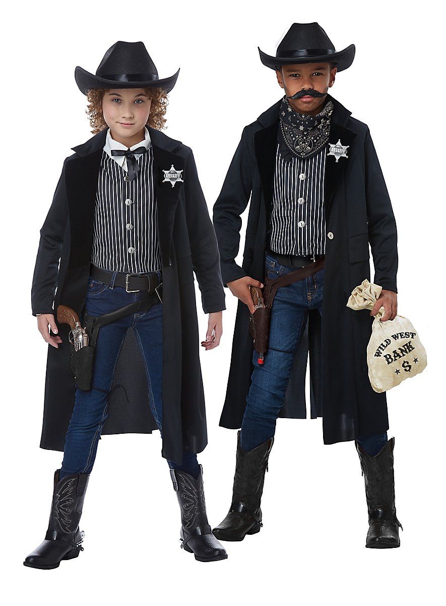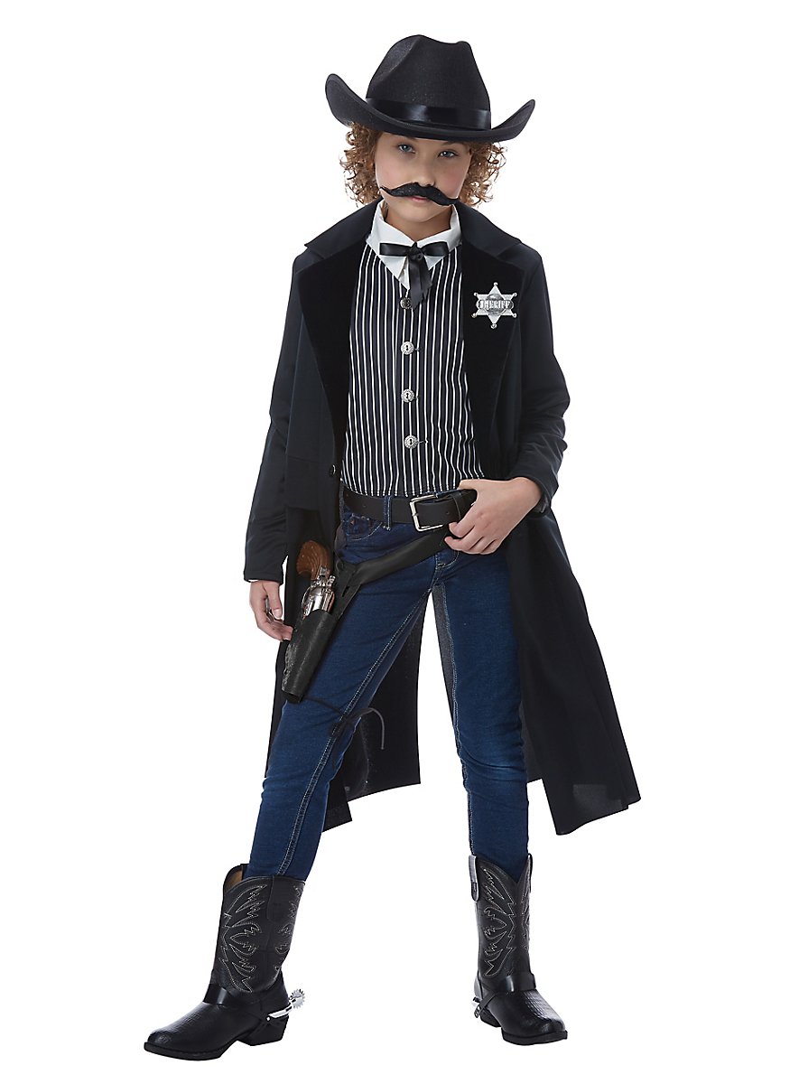 • ein Mantel mit eingenähter Weste, Cowboyhut, Halstuch, Schnurrbart, Sheriffstern und Geldsack
