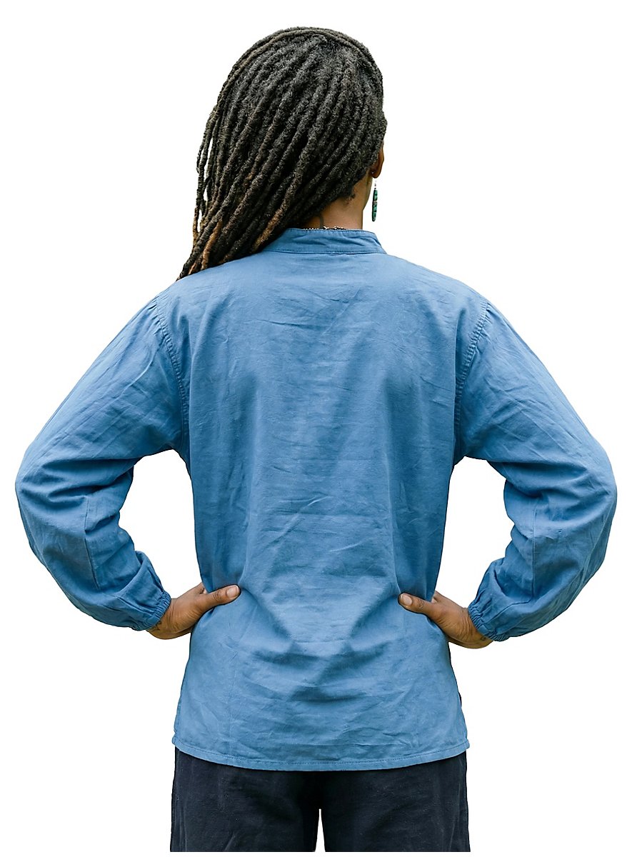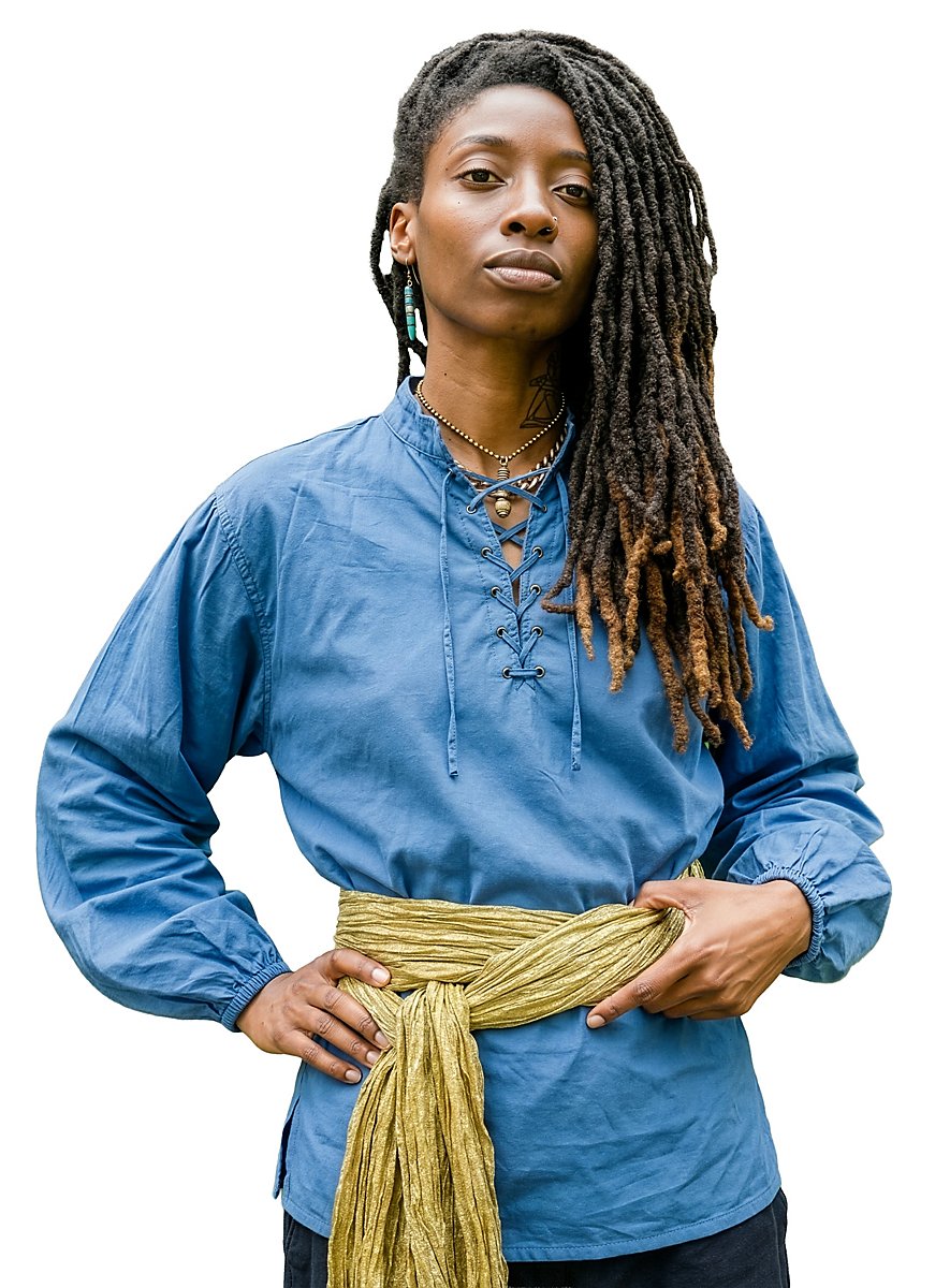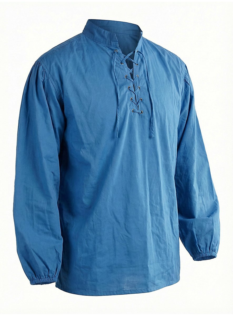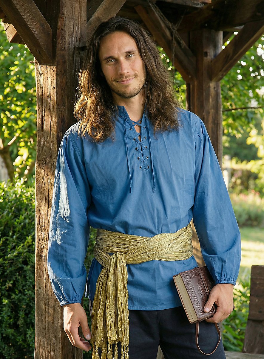 Wenn der Knecht nach getaner Arbeit anlässlich anstehender Dorf-Festlichkeiten nach einer geeigneten Oberbekleidung sucht, dann ist dieses ansehnliche Hemd in strahlendem Blau die erste Wahl. Die wellig wogenden Ärmel und der tiefe, schnürbare Ausschnitt verleihen dem blauen Knecht-Hemd aus reiner Baumwolle eine besonders luftige und leichte Note. Die weiten Ärmel sind im Bereich der Manschetten mit einem elastischem Bund versehen und dadurch gerafft. Gekleidet in dieses schicke blaue Hemd beeindruckt der Knecht selbst die holde Damenwelt mit Leichtigkeit!
