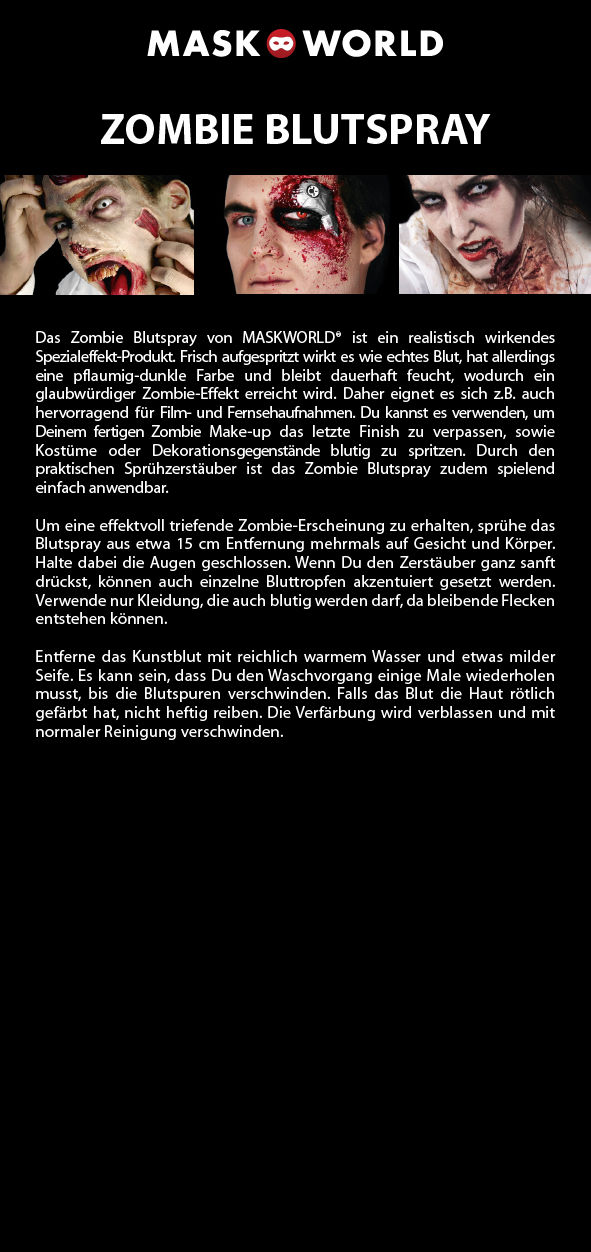 Das Zombie Blutspray von maskworld ist ein realistisch wirkendes Spezialeffekt-Produkt. Frisch aufgespritzt wirkt es wie echtes Blut, hat allerdings eine pflaumig-dunkle Farbe und bleibt dauerhaft feucht, wodurch ein glaubwürdiger Zombie-Effekt erreicht wird. Daher eignet es sich z.B. auch hervorragend für Film- und Fernsehaufnahmen. Du kannst es verwenden, um Deinem fertigen Zombie Make-up das letzte Finish zu verpassen, sowie Kostüme oder Dekorationsgegenstände blutig zu spritzen. Durch den praktischen Sprühzerstäuber ist das Zombie Blutspray zudem spielend einfach anwendbar.