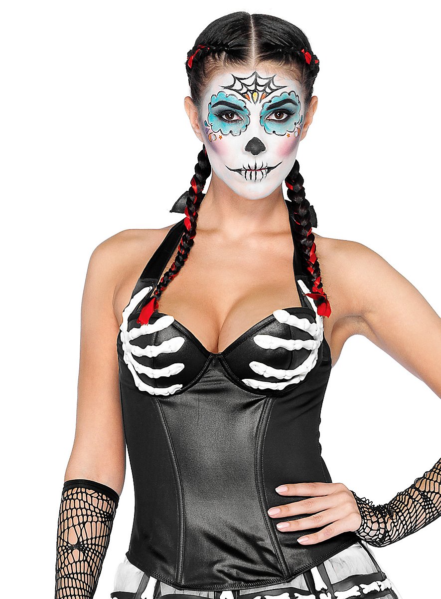 Il corpetto in osso nero lucido è dotato di stecche di piume che scolpiscono la figura e si chiude sul retro con una robusta chiusura a gancetto. Due larghe fasce di tessuto sono attaccate all'orlo superiore per un miglior sostegno e si possono legare insieme alla nuca. Una caratteristica speciale di questo sensazionale corpetto: grazie alle mani scheletriche dall'aspetto realistico, realizzate in plastica bianca flessibile, sembra che Padre Morte sia proprio dietro di te e ti afferri senza esitazione!