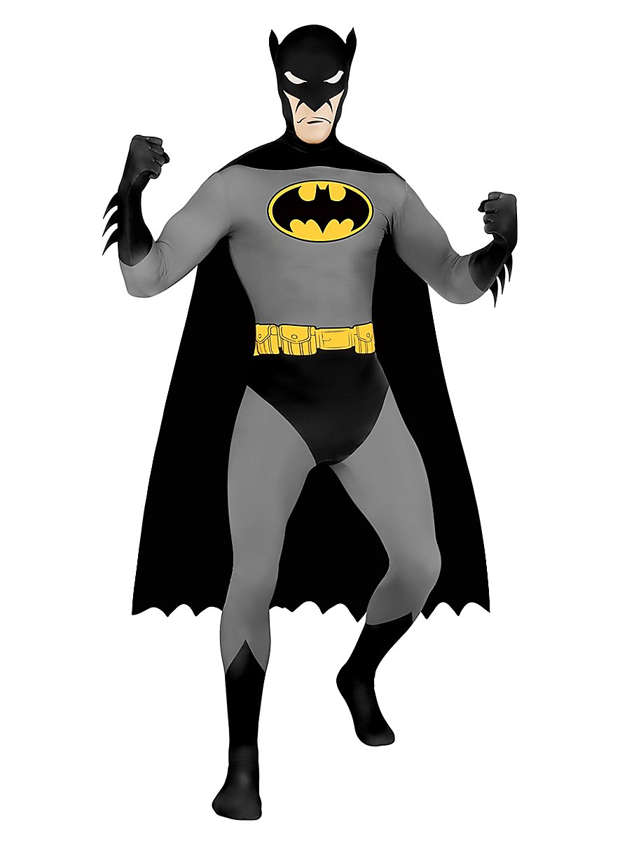 Il costume originale in licenza consiste in una tuta che si chiude sul retro con una zip ed è realizzata in materiale morbido ed elastico di colore grigio. Copre tutto il corpo, comprese le mani e i piedi, ed è stampata con il logo giallo di Batman e i cinturini sul davanti, oltre a guanti, pantaloncini e stivali neri. Naturalmente è incluso un mantello nero separato e una maschera in tessuto facilmente rimovibile che avvolge completamente la testa. Il materiale è elastico e puoi riconoscere facilmente ciò che ti circonda attraverso il tessuto. I tratti del viso simili a quelli dei fumetti sono stampati sulla maschera come simpatico dettaglio e le orecchie a punta spuntano ai lati.