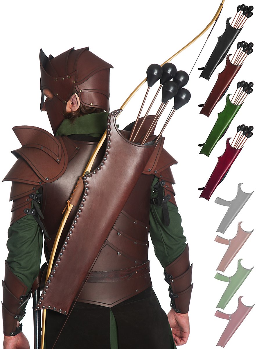 La nostra faretra - Elfo è realizzata in pelle da armatura spessa 3-4 mm e offre spazio per 8-10 frecce da LARP standard. È disponibile in una versione con cinghia per il trasporto dorsale (da indossare sulla parte superiore del corpo) e in una versione con cinghia per il trasporto laterale, che consente di tirare la faretra su una cintura. Con questa faretra è possibile trasportare sulla schiena un arco da equitazione, come mostrato nell'immagine. Con un po' di pratica, è possibile indossarla e toglierla facilmente.
