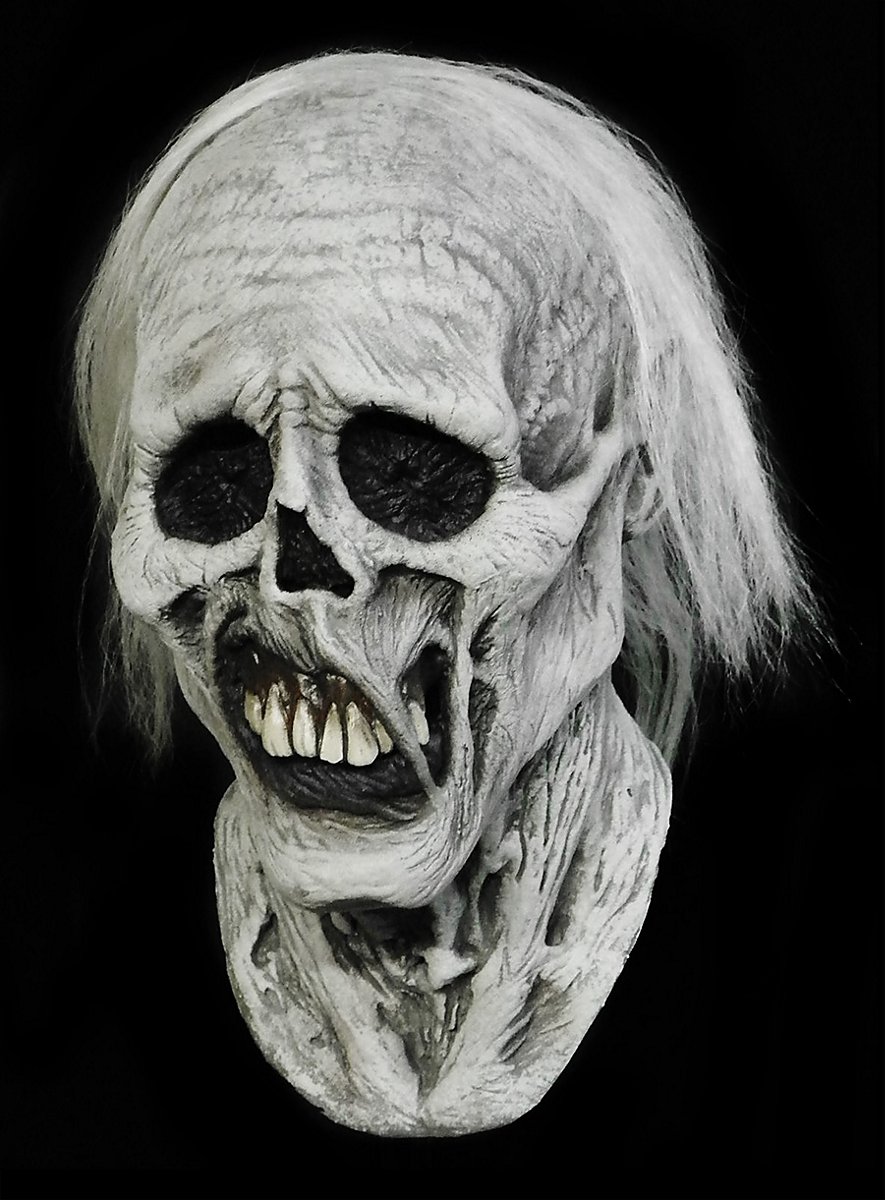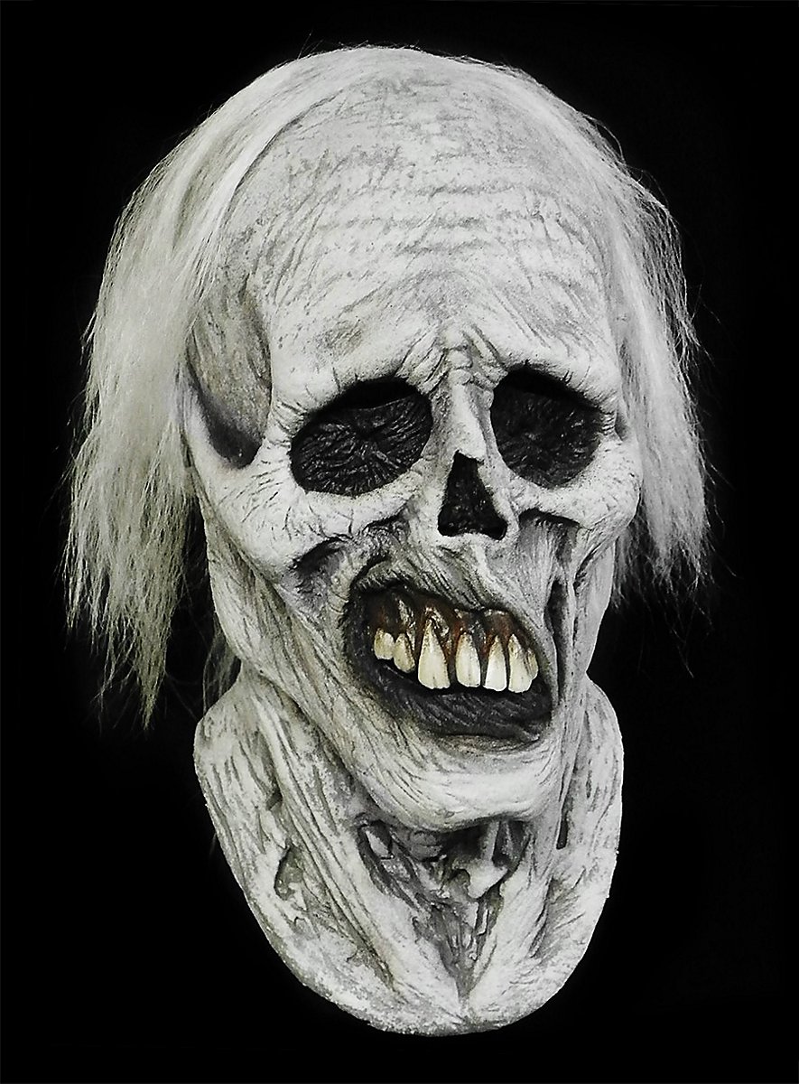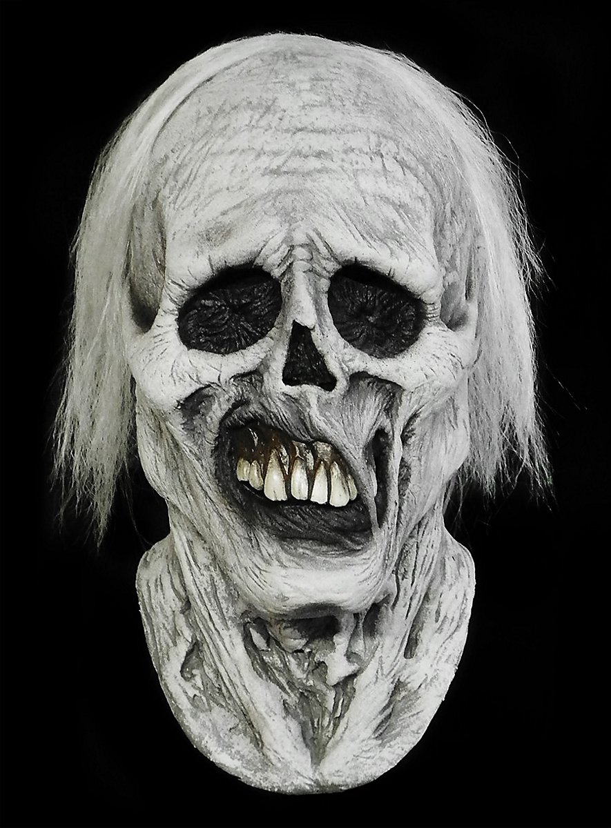 La maschera da vecchio cadavere in lattice dà l'aspetto raccapricciante di qualcuno che è morto da tempo. La pelle fibrosa e secca, simile a carne, si estende in fili coriacei sul cranio. Il labbro superiore è marcito, esponendo gli incisivi. Le orbite oculari e il naso sono ricoperti da un tessuto nero e spugnoso... che schifo! Alcune sottili ciocche di capelli sintetici bianchi come la neve coprono il cranio rugoso. Nessun altro sembrerà così morto alla prossima festa di Halloween o horror - promesso!