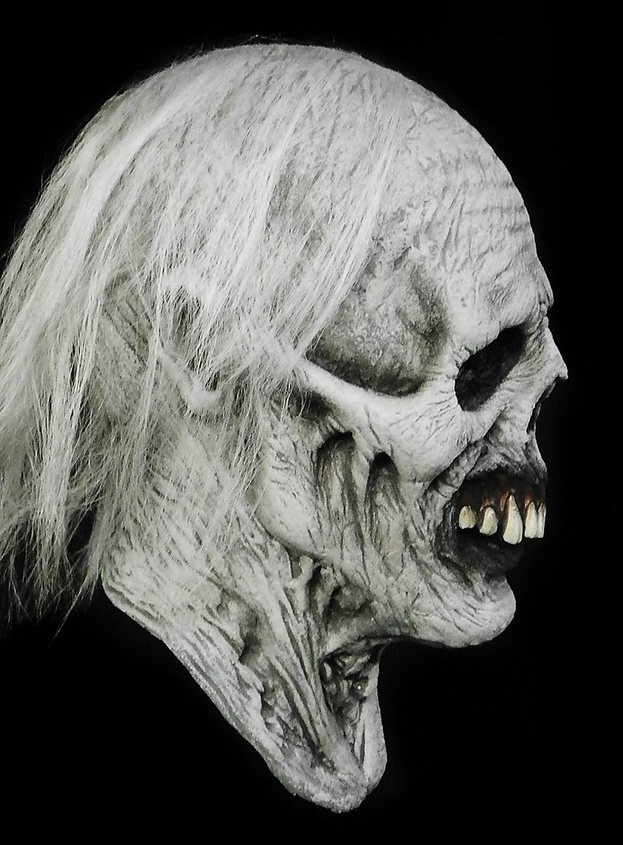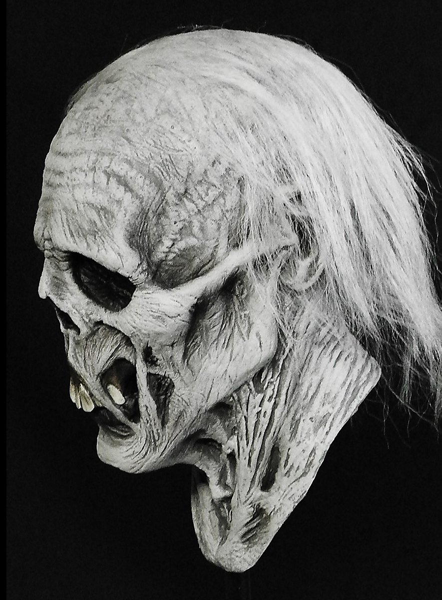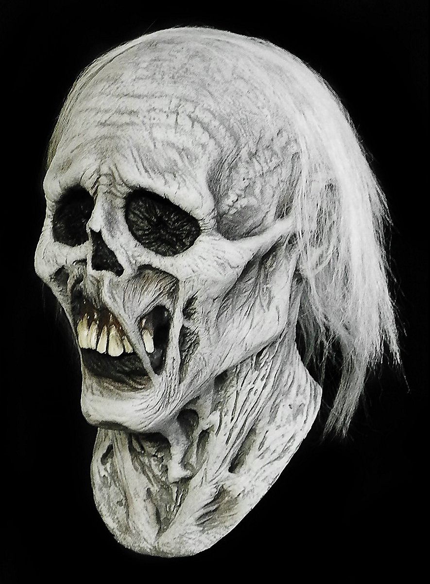 La maschera da vecchio cadavere in lattice dà l'aspetto raccapricciante di qualcuno che è morto da tempo. La pelle fibrosa e secca, simile a carne, si estende in fili coriacei sul cranio. Il labbro superiore è marcito, esponendo gli incisivi. Le orbite oculari e il naso sono ricoperti da un tessuto nero e spugnoso... che schifo! Alcune sottili ciocche di capelli sintetici bianchi come la neve coprono il cranio rugoso. Nessun altro sembrerà così morto alla prossima festa di Halloween o horror - promesso!