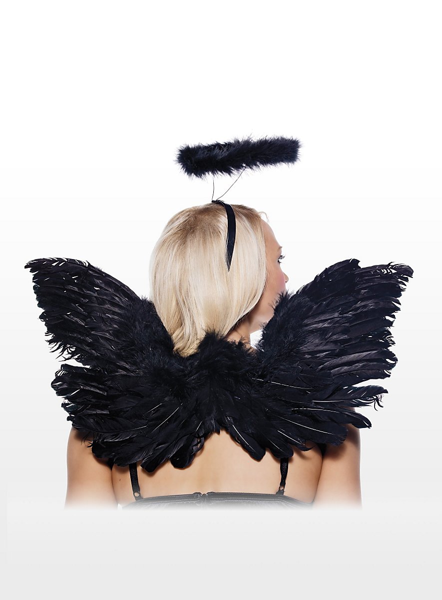 Il set di accessori da angelo nero sexy include un paio di ali nere da angelo realizzate con piume artificiali e un cerchietto per capelli con una soffice aureola che farà la sua figura in qualsiasi festa in maschera.